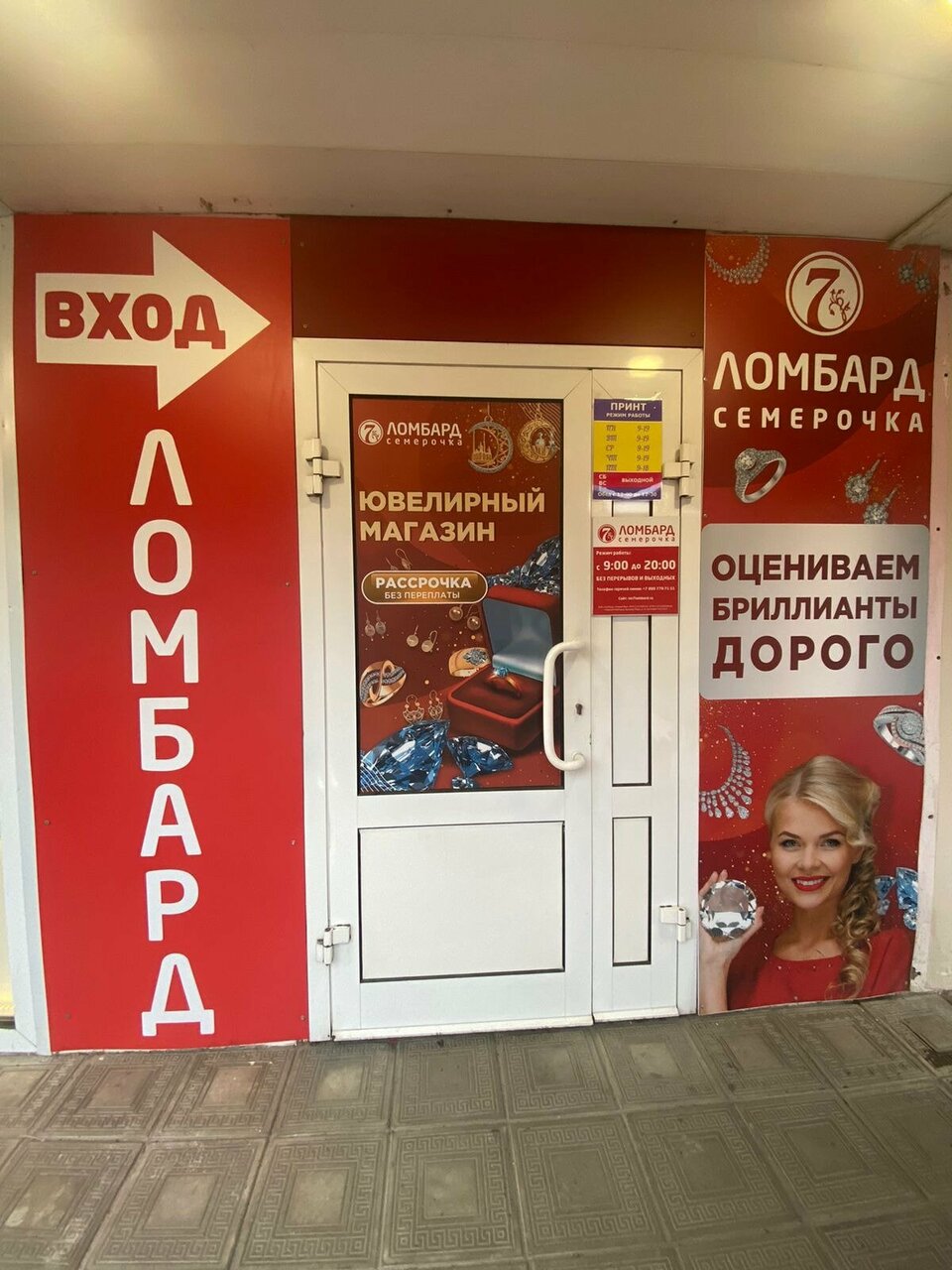 Ломбард работает ежедневно с 09:00 до 20:00. Для связи доступны телефоны: +7 (967) 255-30-75 (номер филиала) и 8 (800) 101-11-70. Подробная информация представлена на официальном сайте: https://7-lombard.ru/.