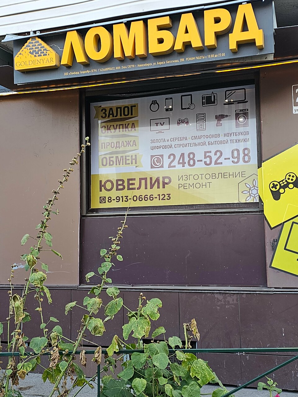 GoldenYar работает ежедневно с 10:00 до 21:00. Для связи доступен телефон: +7 (383) 248-52-98. Дополнительные услуги включают страхование и хранение залога, а также возможность получить займы под залог компьютеров, телефонов, оргтехники и других категорий ценностей.